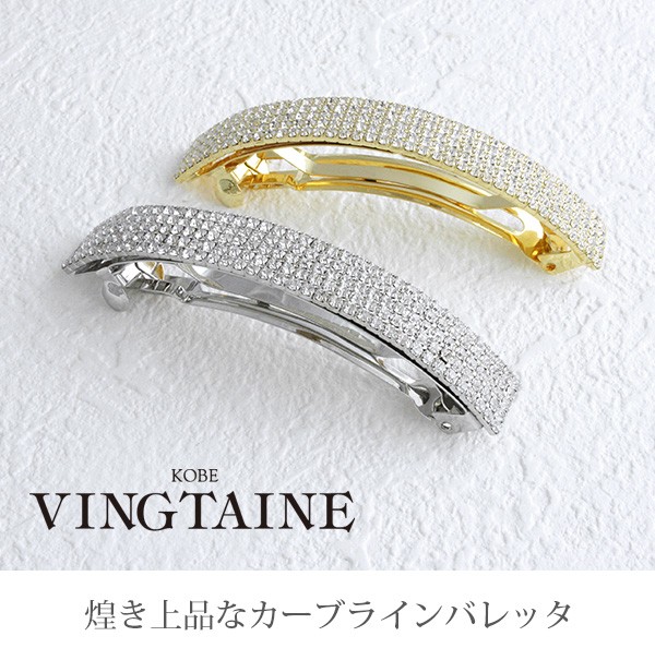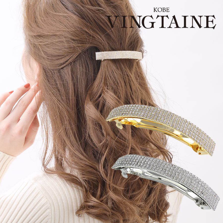 5連のラインストーンが華やかに煌くバレッタは、ヘアにフィットするカーブがポイント。留めるだけで上品な仕上がりになるので、デイリーはもちろん、パーティーシーンにもオススメです。
