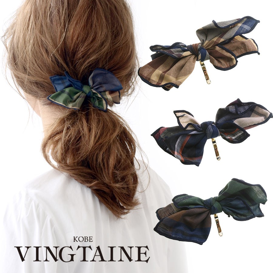 チェック柄リボンポニーフック ヘアカフ ヘアフック ヘアゴム H7326 レディース かわいい 大人っぽい ヴァンテーヌ