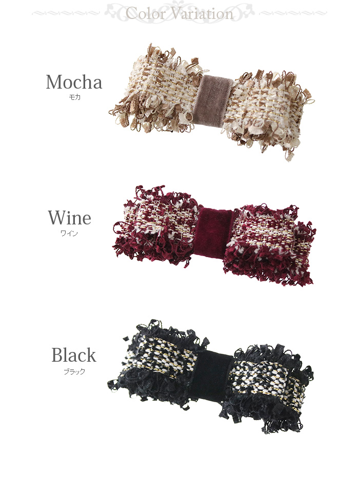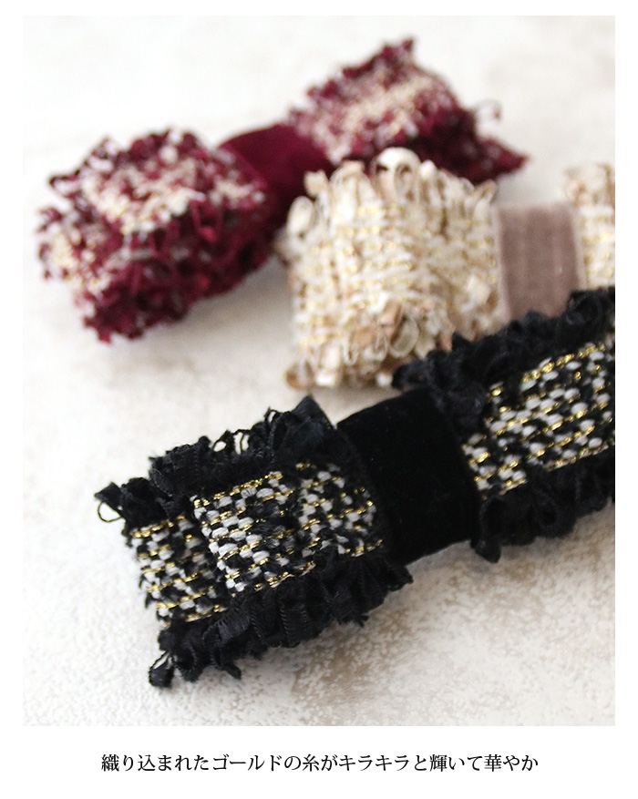 シーズンムード高まるツイード素材のバレッタ。クラシックにも大人のカジュアルスタイルにも取り入れやすい逸品。リボンデザインが可愛らしさもプラスしてくれます。サイドを留めたりまとめ髪にONしたりと様々なアレンジができるバレッタ。織り込まれたゴールドの糸がキラキラと輝いて華やか。定番のブラックに可愛らしいモカ、ワンポイントにぴったりなワインの3色展開。