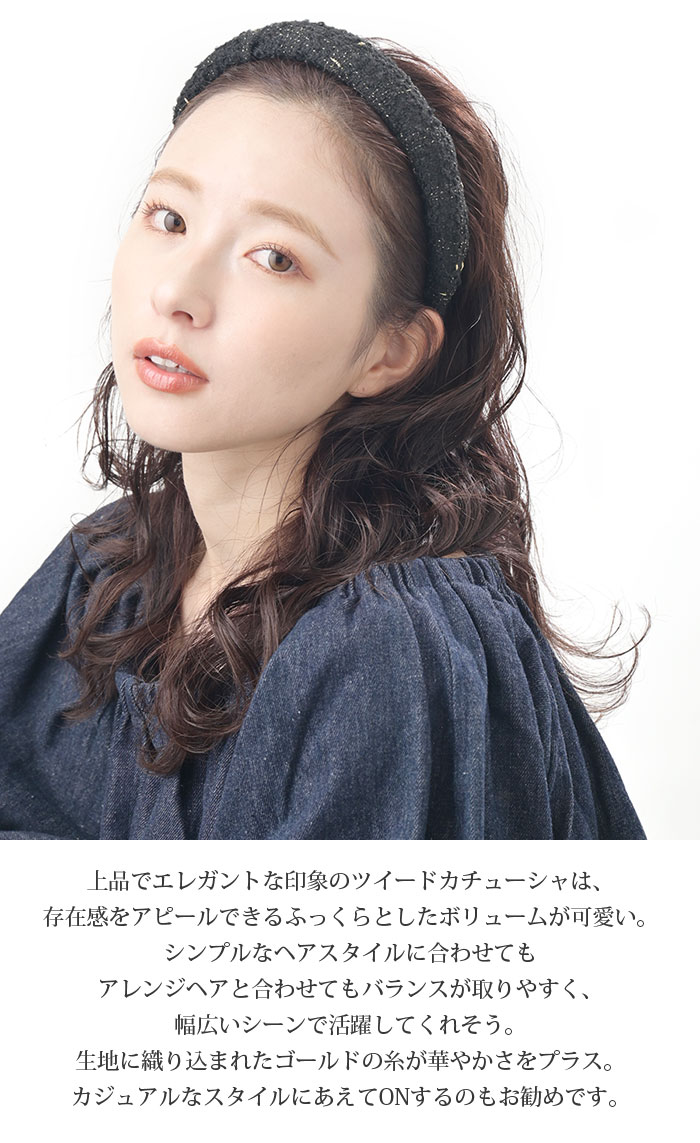 上品でエレガントな印象のツイードカチューシャは、存在感をアピールできるふっくらとしたボリュームが可愛い。シンプルなヘアスタイルに合わせてもアレンジヘアと合わせてもバランスが取りやすく、幅広いシーンで活躍してくれそう。 生地に織り込まれたゴールドの糸が華やかさをプラス。カジュアルなスタイルにあえてONするのもお勧めです。