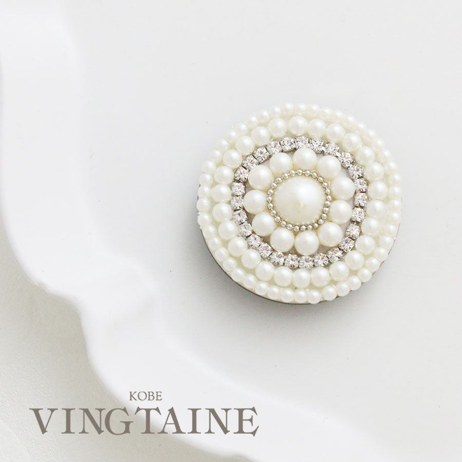 強力マグネットで簡単に装着できるブローチ♪生地に穴をあけたくないシャツやジャケットにも装着できるのが嬉しいポイントです。艶めくパールやラインストーンで模ったサークル型のブローチ。クラシカルなパールの雰囲気がコーディネートに華やかさをプラス。これ一つでもアクセントになるし、他のモチーフと組み合わせて付けたり、色々アレンジも楽しめそう。使わないときは、お部屋のインテリアとしても飾っておきたくなる一品。大切な方へのプレゼントとしてもお勧めです。