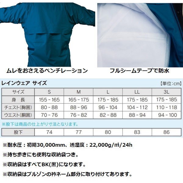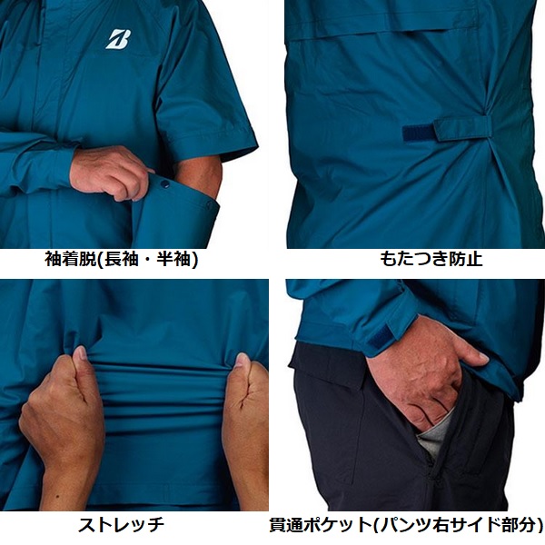 ブルゾンは袖着脱可能、パンツは股下長さ調整やもたつき防止などプレーを妨げないよう細部にまでこだわった機能がついた多機能レインウェア。