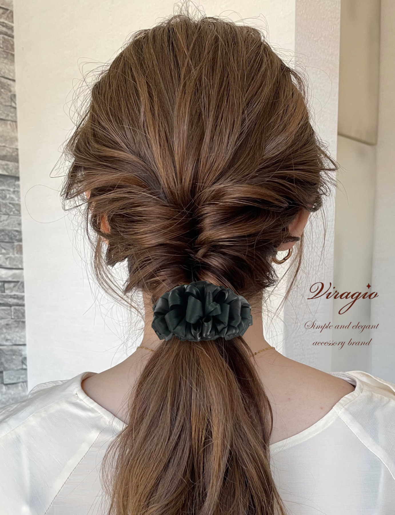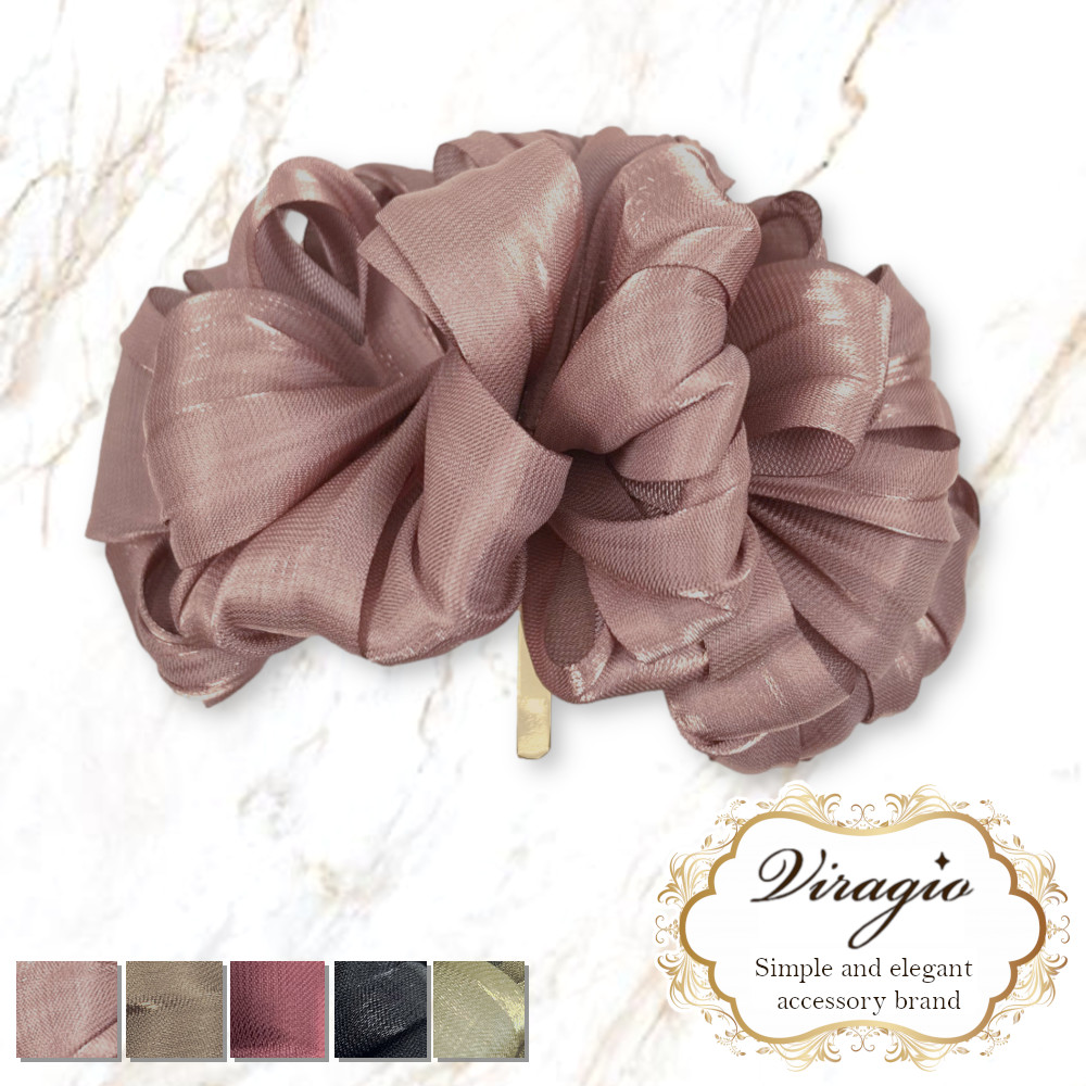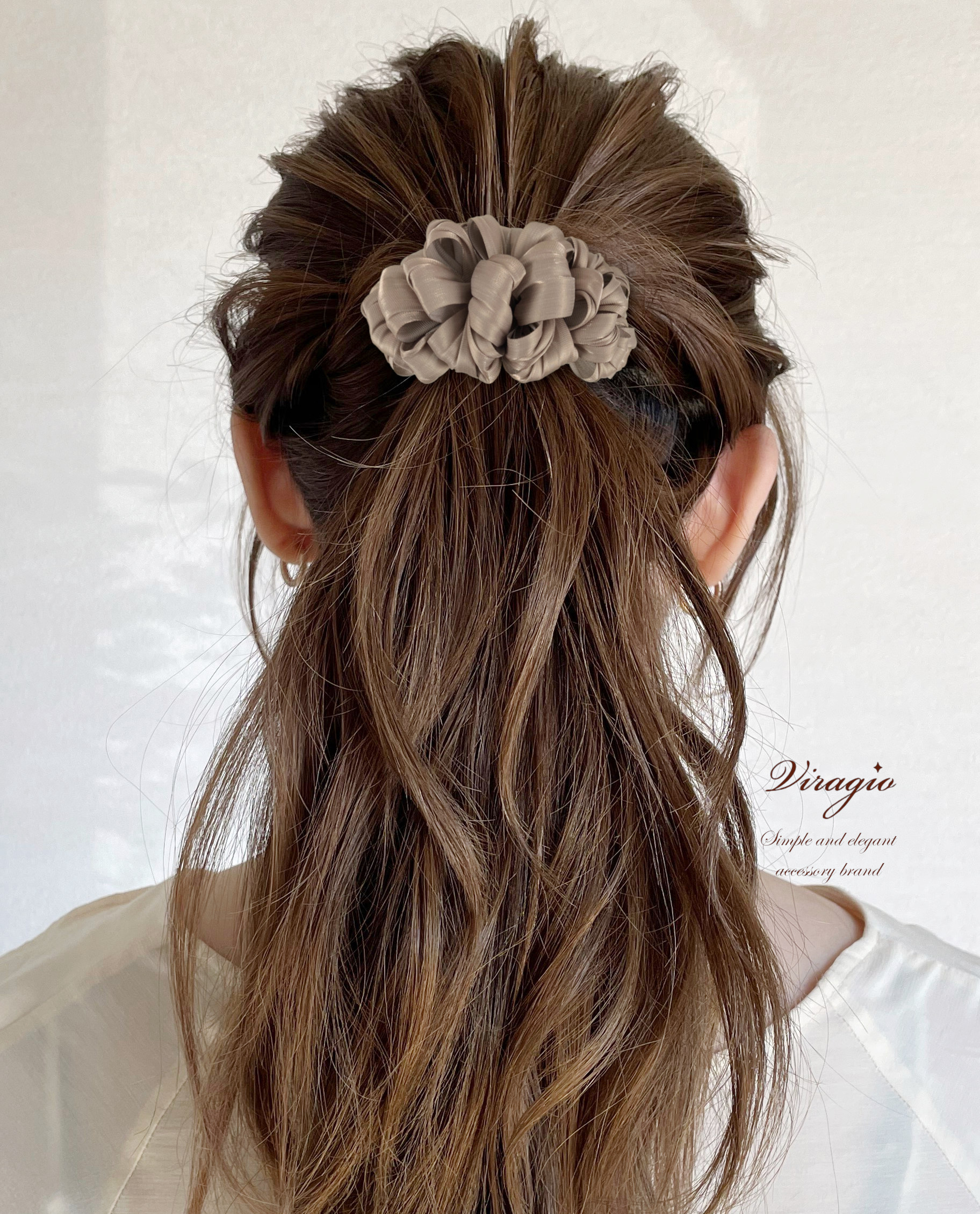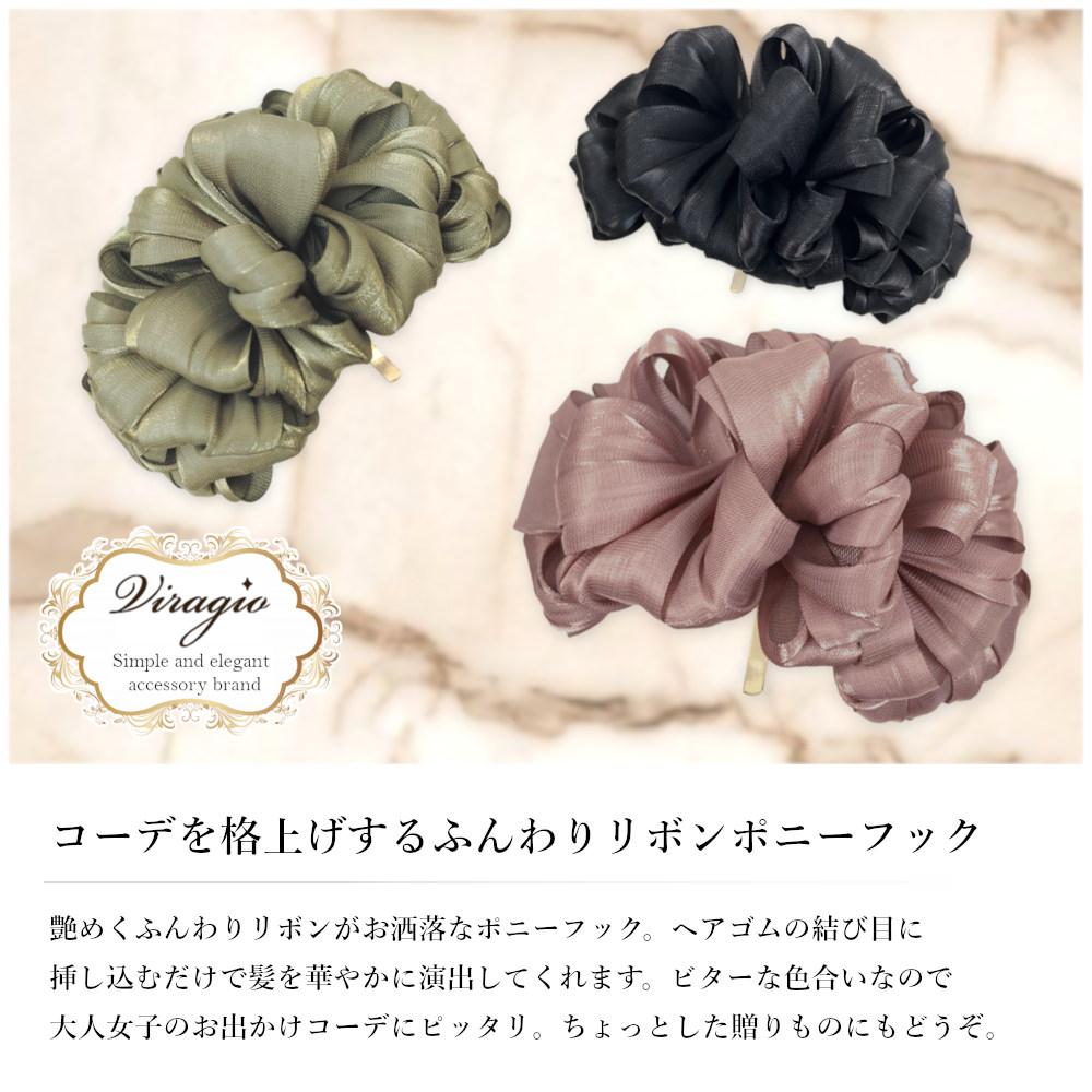 艶めくふんわりリボンがお洒落なポニーフック。ヘアゴムの結び目に