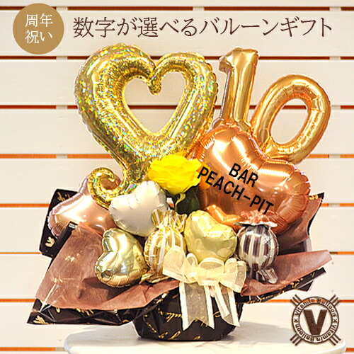 お店の周年祝い。数字のバルーンが選べてさらにプラス名入れができます。名入れはもちろん贈り先のショップ名を入れますね。自分のお店の名入れがされたバルーンギフトをもらうのってきっと最高に嬉しいですよね。大人っぽいゴールド系で仕上げているので華やかと一緒にお気持ちをバルーンにのせて送ることができますよ。