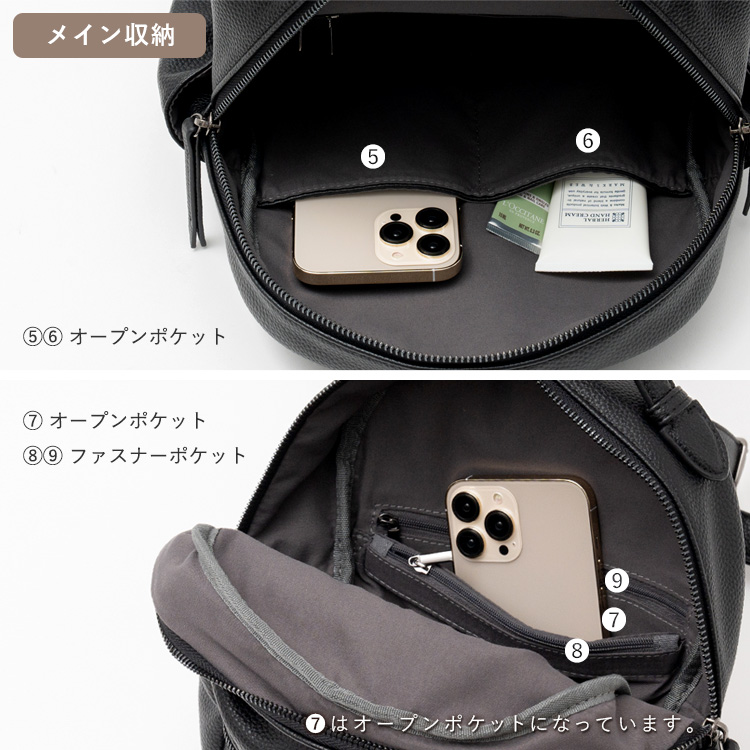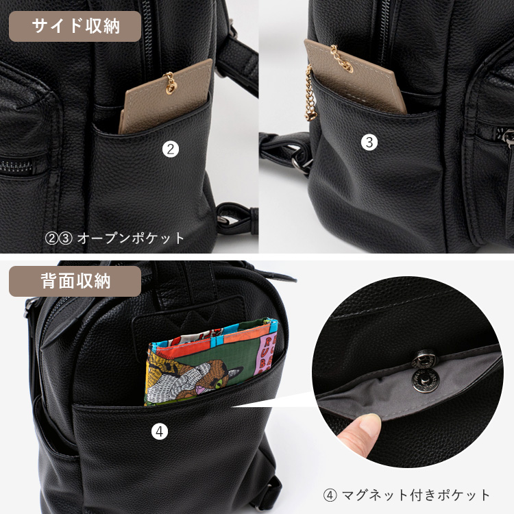 ●外ポケット:前面ファスナー付きポケット1、側面オープンポケット2、背面マグネット付きポケット1