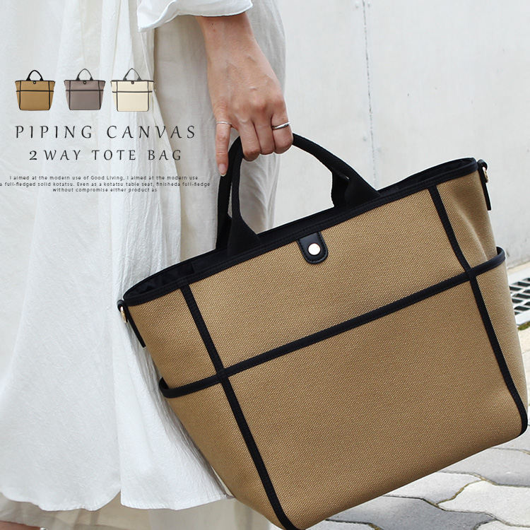 厚手のキャンバス生地にパイピングがアクセントになったトートバッグ。