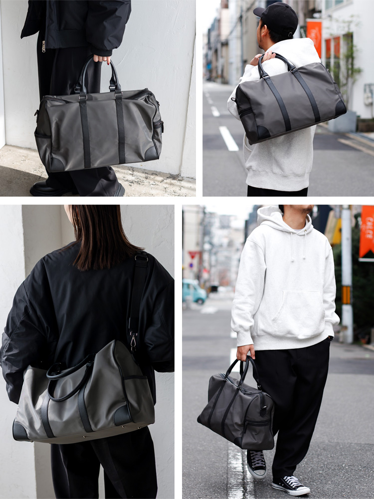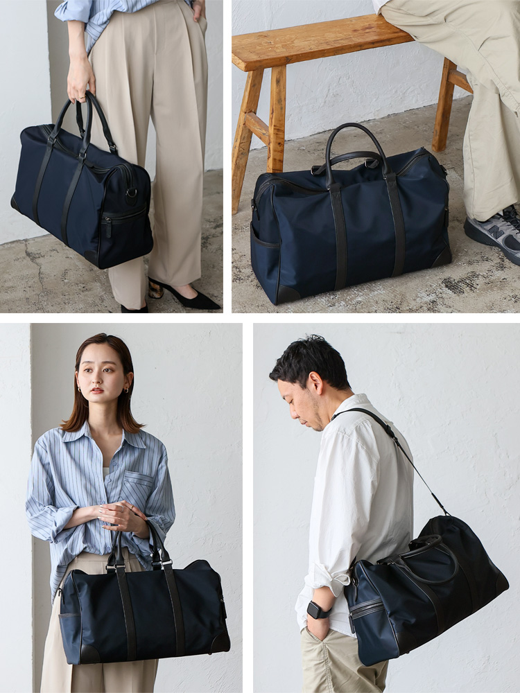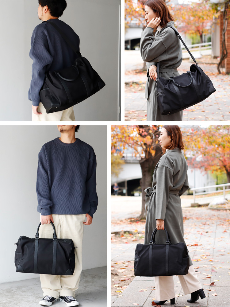ユニセックスで使いやすいシンプルデザインのボストンバッグ。