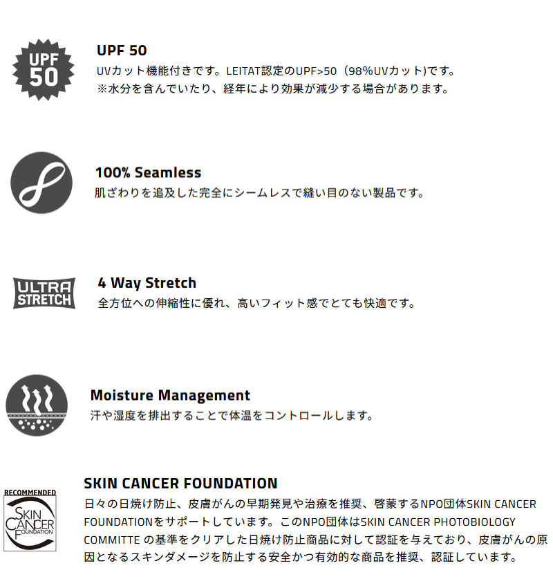 汗を蒸発させ素早く発散し、爽快感を持続させるオリジナル素材で、通年使 できるのが大きな魅力。UVカット(UPF50)機能も付いているので、気になる紫外線から肌を守ってくれるのもうれしい。縫い のないチューブ型構造なので、肌に直接 時間当たり続けていてもストレスなく着 できる