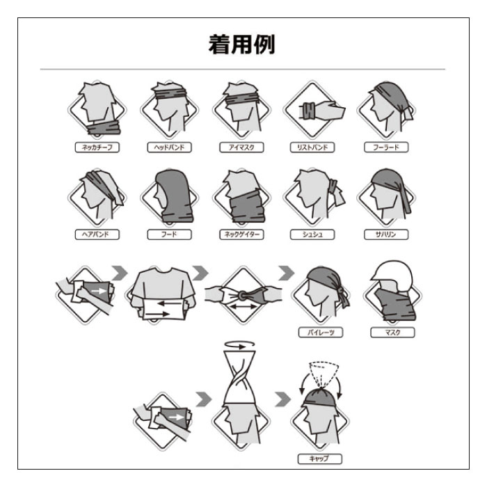 1枚で10通り以上の使い方が可能で、バンダナ・キャップ・ヘッドバンド・ネックウォーマー・ネッカチーフ・ヘアバンド・フェイスガード・フェイスマスク・キャップ・シュシュ・リストバンド・フェイスカバー ・ヘッドギア・ネックカバー・フェイスカバーなど、アレンジは自由自在。トレイルランニングシーンでは以前から愛用者は多かったが、コロナ渦で一躍注目を浴びたことで、普段のランニング時に使用しているというランナーも増え、優れた機能性とファッション性を備えたマルチヘッドウェアとして、世界60ヵ国で愛 されている。