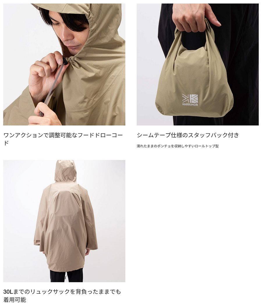 ・濡れたままのポンチョを収納しやすいロールトップ型のスタッフバック付き(シームテープ仕様)