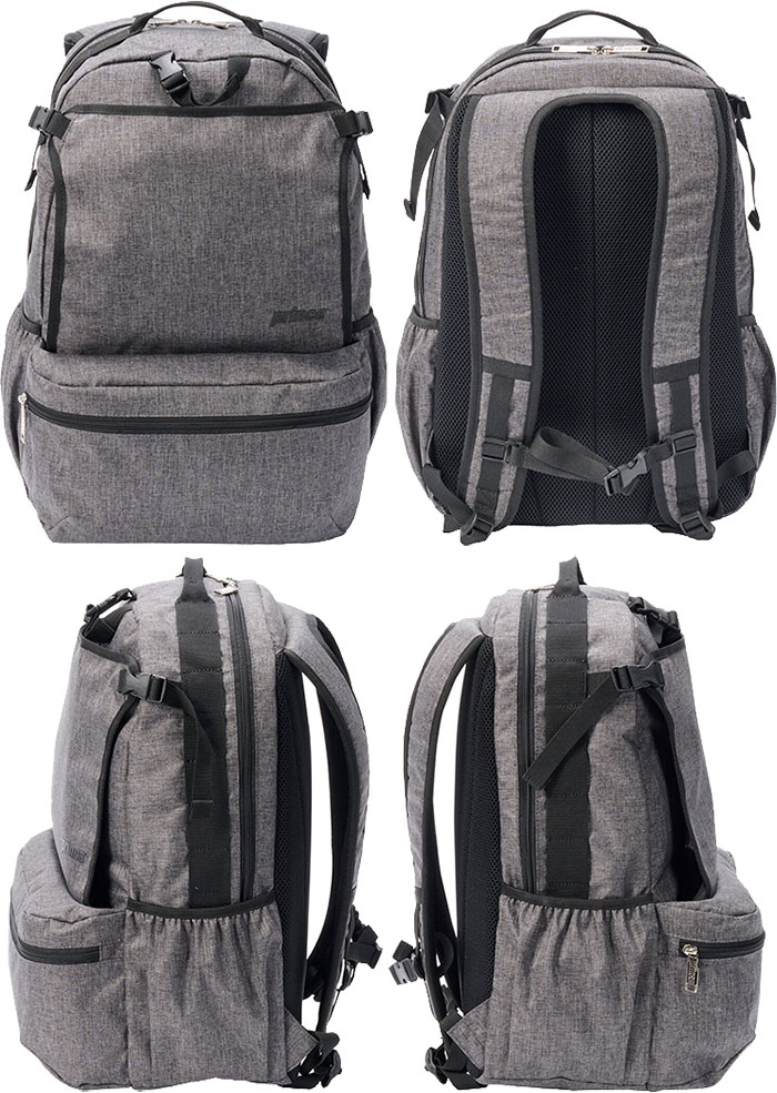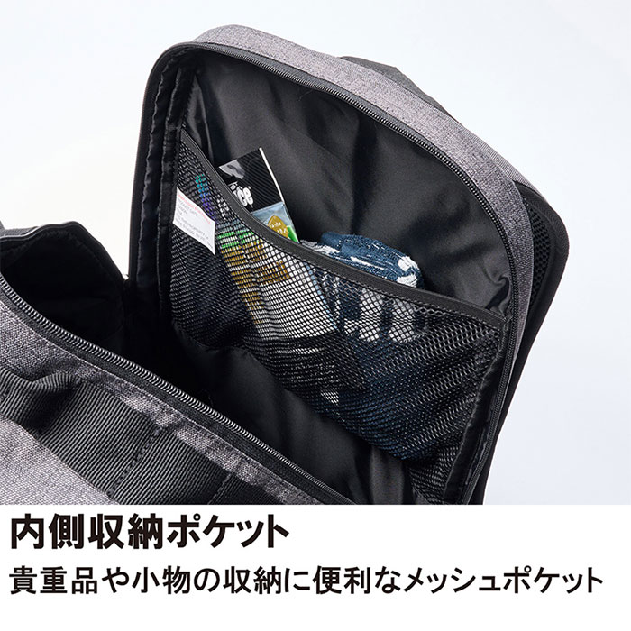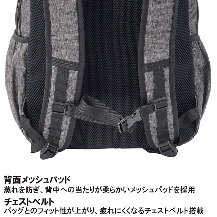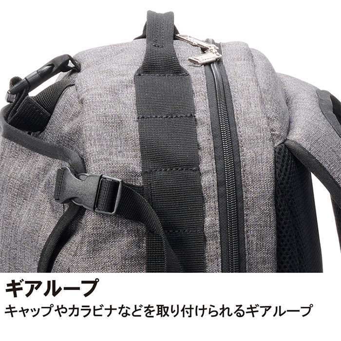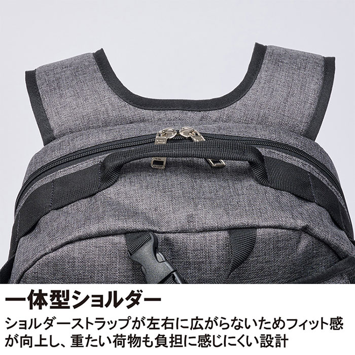 杢調生地を使用し、肩からずり落ちにくい一体型ショルダー採用のバックパック