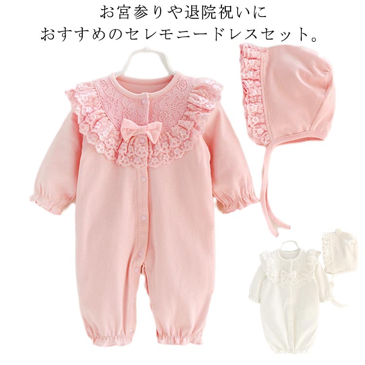 | ・お宮参りや退院祝いにおすすめのセレモニードレスセット。 ・お揃いの帽子がセットになっているのでコーディネートが完成します。 | |
