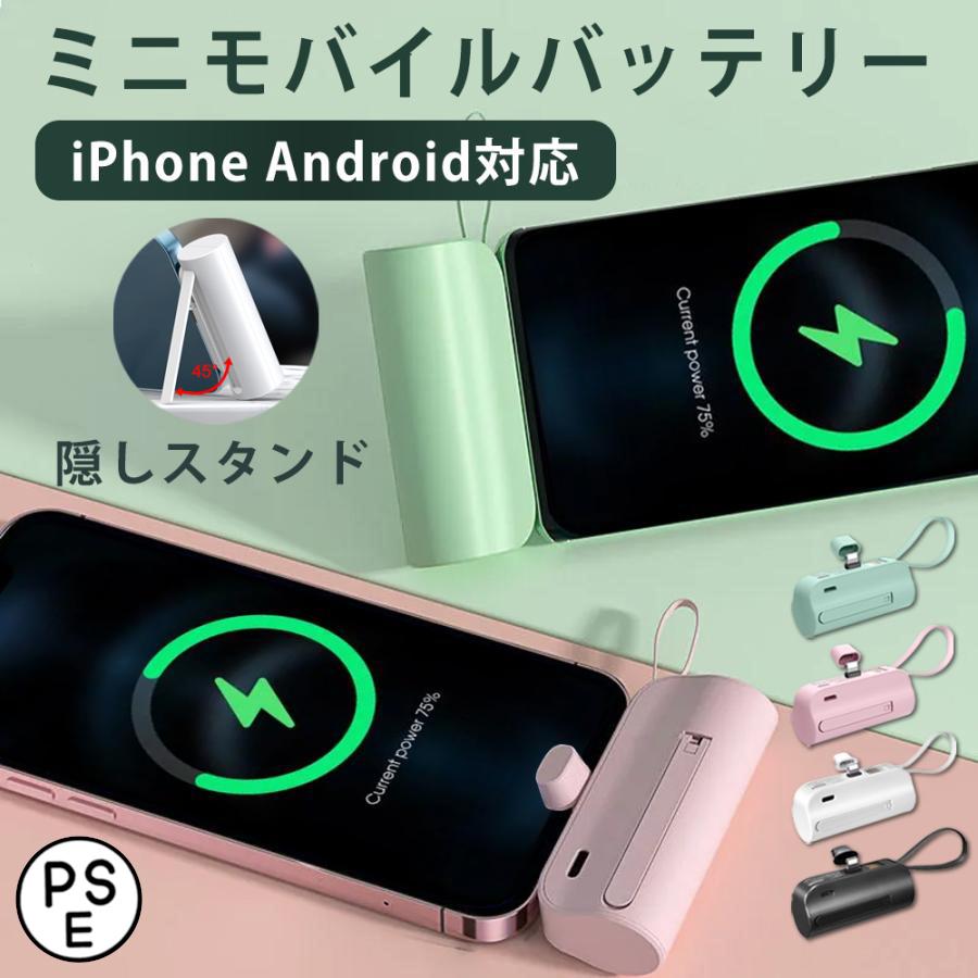【即納】モバイルバッテリー ケーブル内蔵 5000mAh ケーブルいらない 小型 ミニ スマホスタンド付き USB Type-C 直接充電 コネクター内蔵 軽量 コードレス