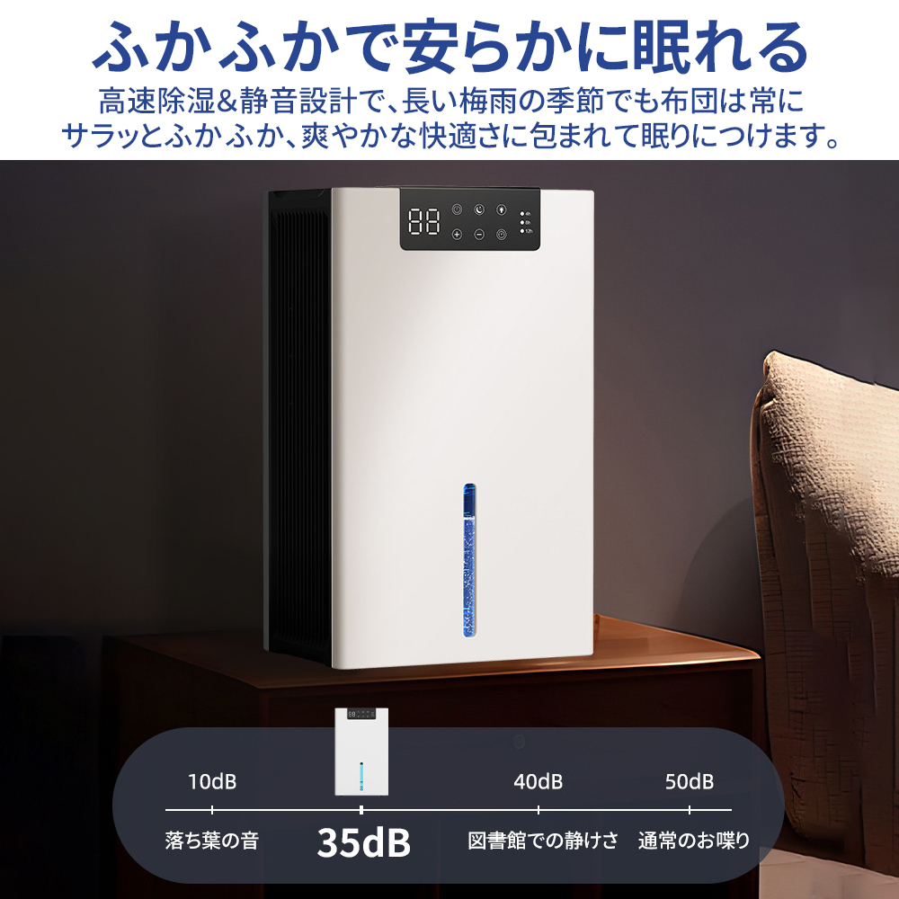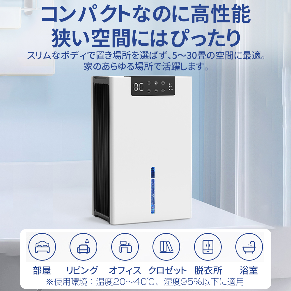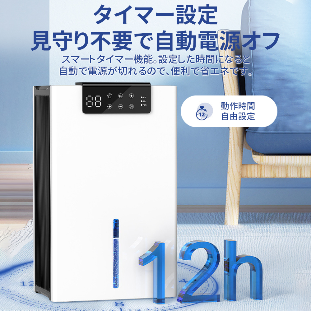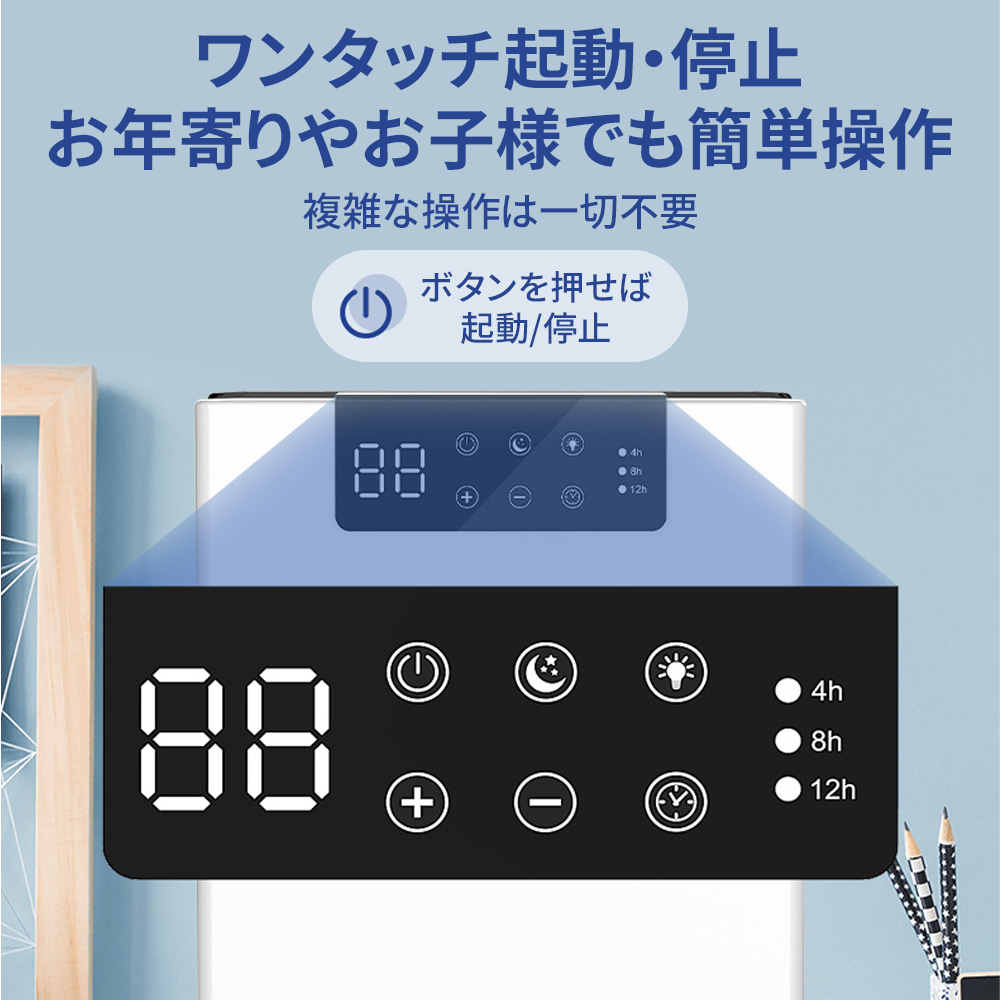【タイマー設定・自動停止】シンプルなボタン操作とLEDディスプレイで、年配の方でも簡単に操作可能です。タイマー機能を活用すれば、出勤時にセットして帰宅時には除湿が完了。水タンクが満杯になると自動で停止するので、外出中でも水漏れの心配がありません