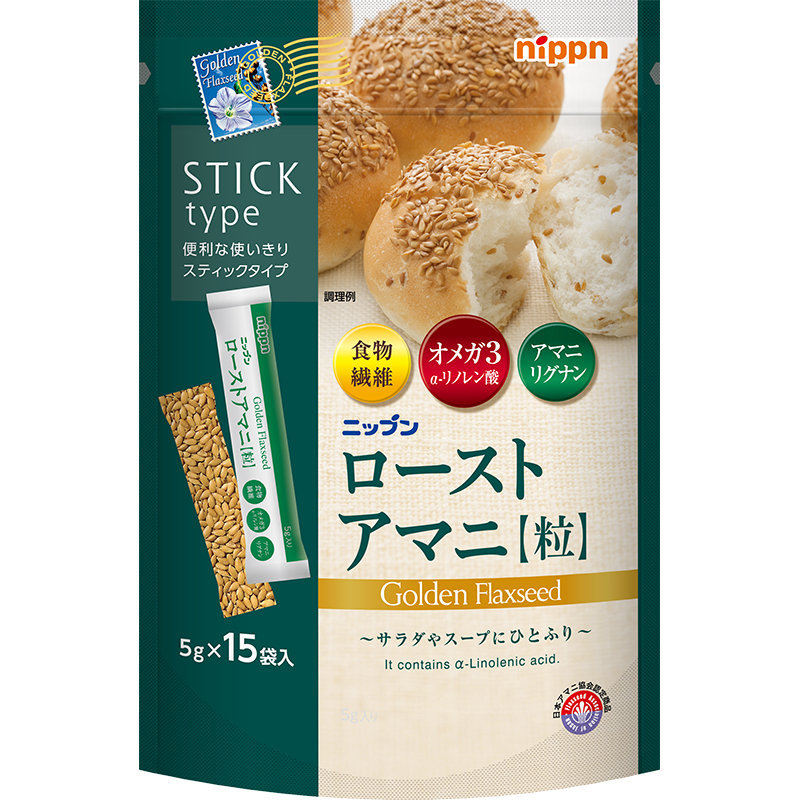 「Golden Flaxseed ローストアマニ粒 5g×15本入」は、オメガ3脂肪酸、食物繊維、アマニリグナンを含むゴールデン種のアマニを香ばしくローストしました。5gずつスティック個包装していますので、計量の必要がなく携帯にも便利です。
