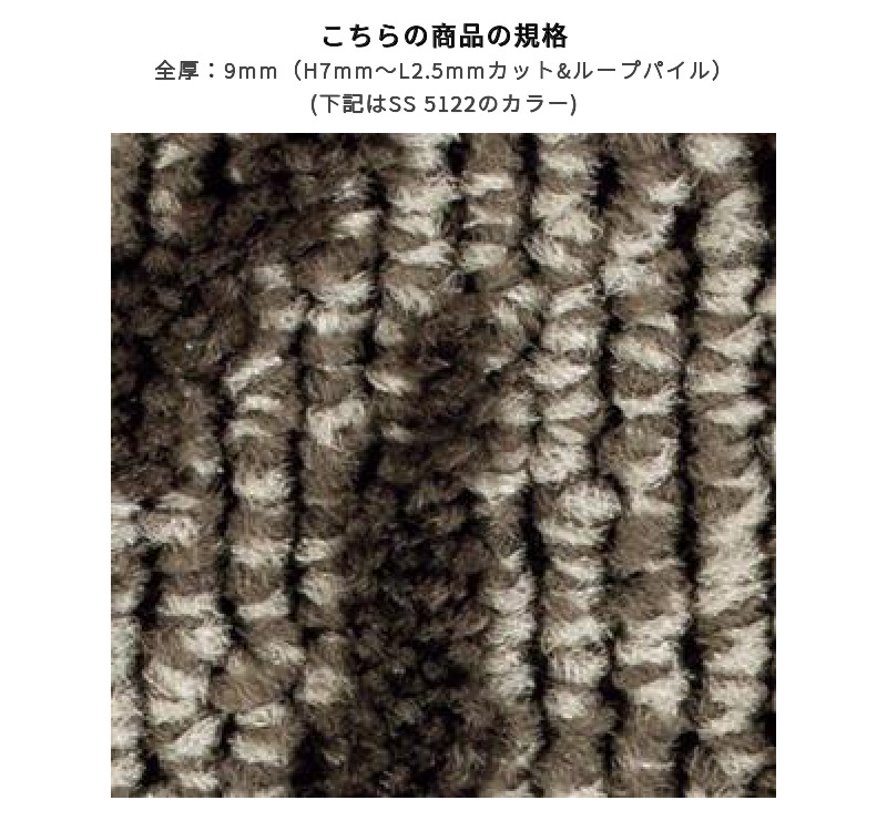 全厚:9mm(H7mm〜L2.5mmカット&ループパイル)