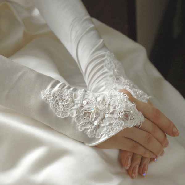 ドレスの刺繍、ビーズとお揃いのように見え、肘よりも長いこのグローブはとても上品で素敵な物です。
