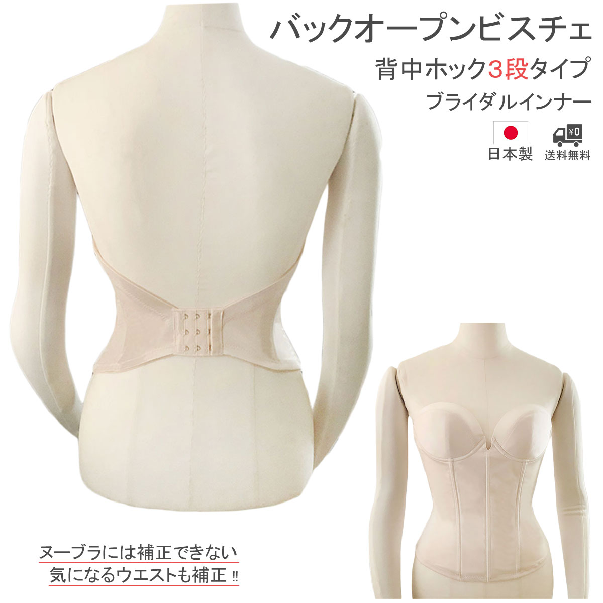 (背中の開きは少し狭くなりますが、バストのシェイプアップ機能がもう少しほしい場合は、*商品番号:L26 インナーがおすすめです。)