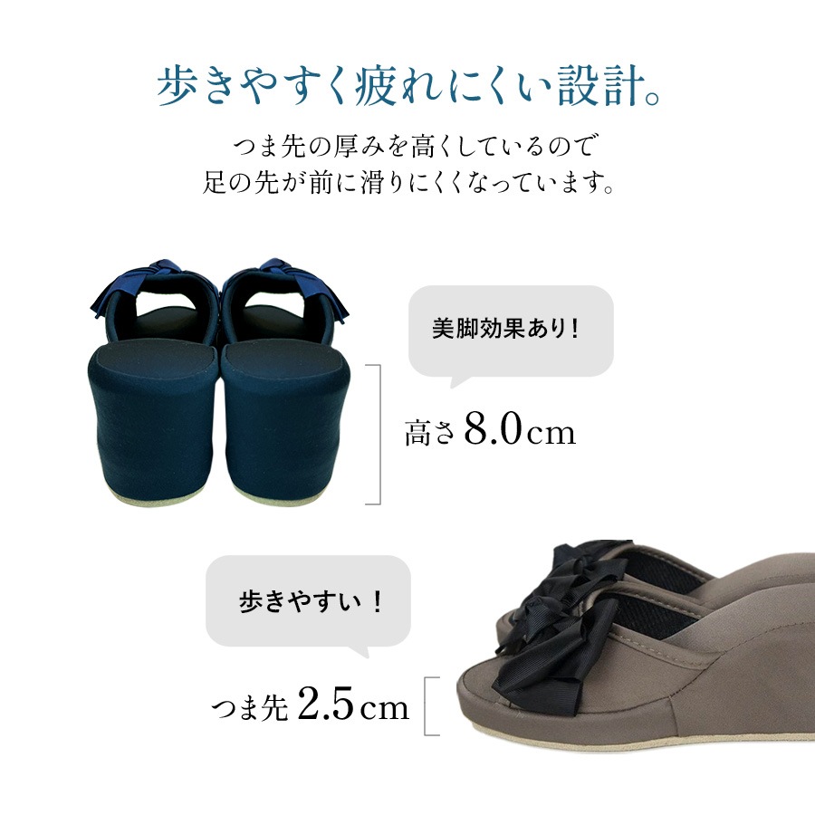 | 商品説明 | 大きな3重のグログランのリボンが特徴のハイカットのルームシューズ。「ヒールを履いて学校に行ったらスリッパに履き替えた途端におしゃれ度が…。」 「急に背が低くなって気になる…。」 「家でもおしゃれでいたい〜。」等々。 女性の希望を叶えたスリッパです。 裏底は大きな音が出にくい静音仕様のベージュと汚れてもお手入れが簡単な撥水仕様のブラックの2タイプからお選びいただけます。 【履きやすさも考えられたデザイン】 つま先が厚く、前にすべらないよう足にそったアーチが入っています。また、長時間ご使用されてもへたりにくく丈夫なつくりです。 【大きめのリボンがアクセント】 印象的な大きめのリボンがアクセントになり、豪華さを演出しています。 履いているだけで、エレガントな気分になれそう。 シックな色合いが高級感を感じさせ、ご自宅用にはもちろん、来客用にもご使用できます。 卒業式、入学式などのフォーマルな場にもおすすめです。 ※スリッパが入る手さげバッグもございます。ご購入はこちら ※使用感には、個人差があります。 ※ひとつひとつ手作りで製作しておりますので、色柄・質感などに個体差が出る場合がございます。 ※製造工程上、スリッパ本体と裏底の接着部分に若干の接着剤のはみ出しが見られる場合がございます。ご使用には問題ございませんので、あらかじめご了承ください。 |