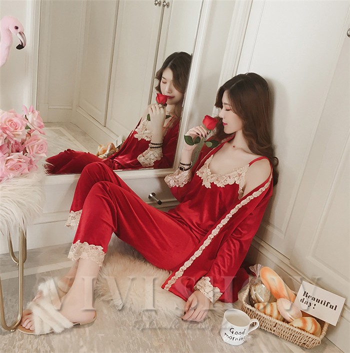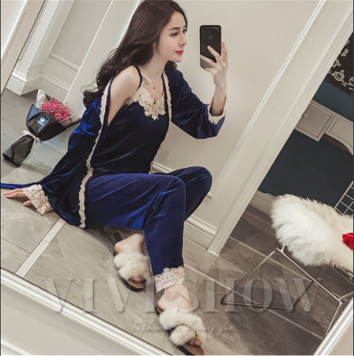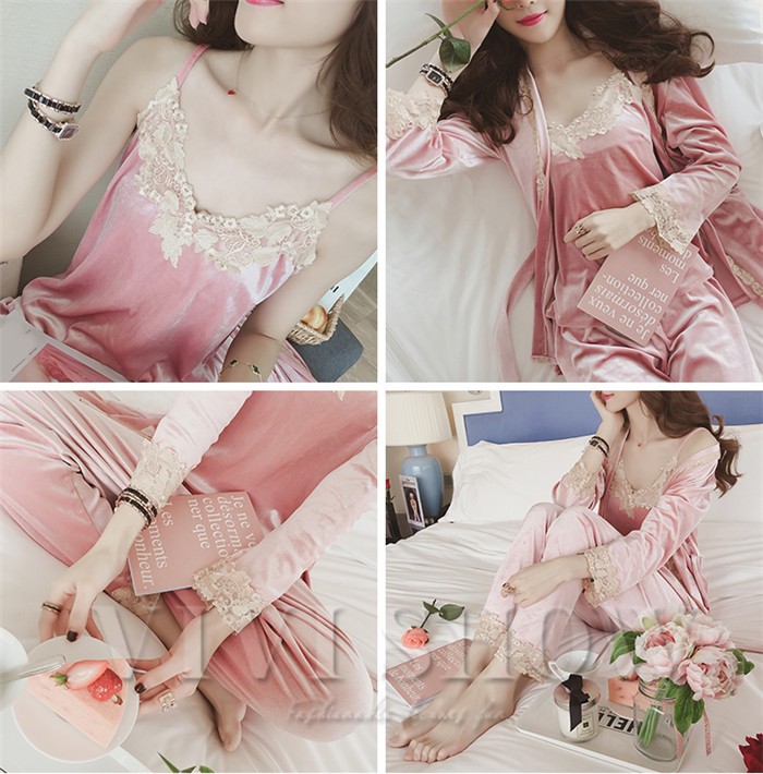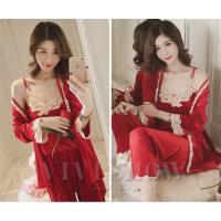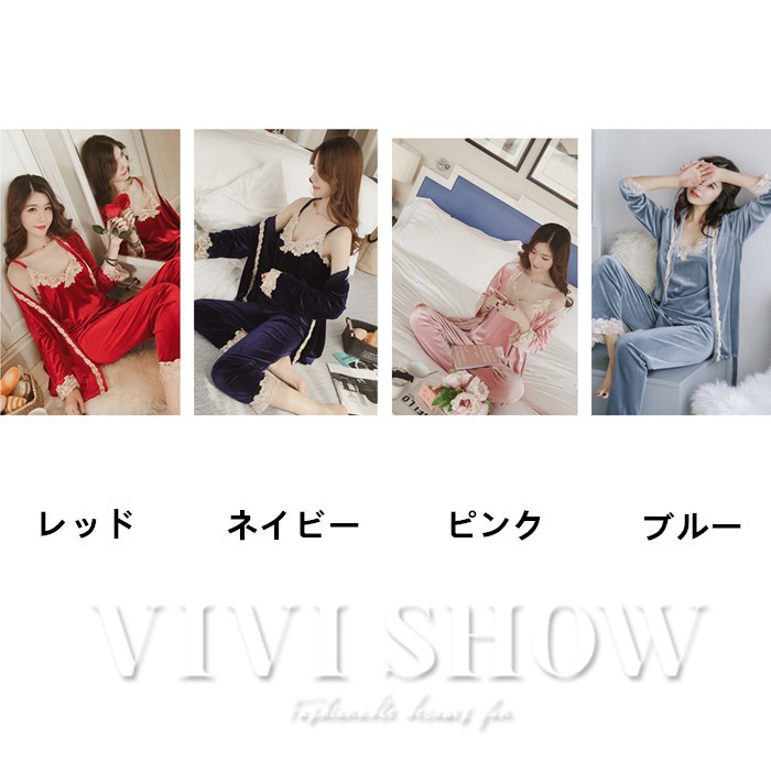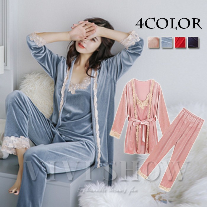 パジャマ 3点セット 前開き パジャマ 長袖ガウン ロングパンツ ルームウェア 女性 オシャレエレガント ランジェリー 人気