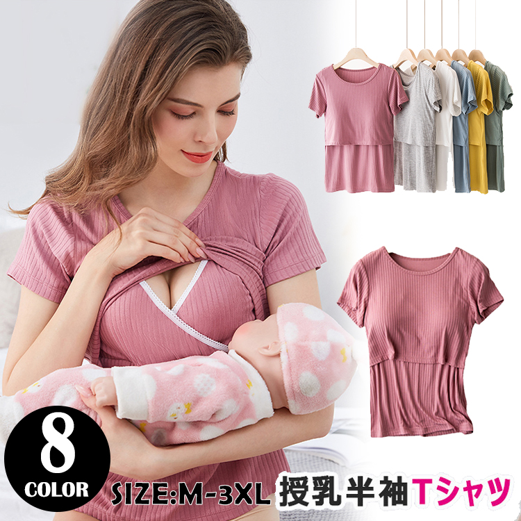 マタニティ トップス 半袖 授乳服 胸元クロスオープン インナー 授乳用 半袖 Tシャツ 授乳トップス 産前産後 ルームウエア
