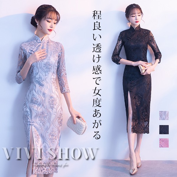 チャイナドレス風ワンピース レディース レース ロング丈 七分袖スリット 結婚式 二次会 エレガント パーティー きれいめ おしゃれabr vivishow