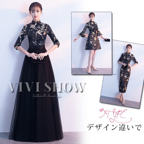 チャイナドレス風ワンピース レディース 七分袖 ロング丈 膝丈 刺繍 パーティードレス エレガント 結婚式 二次会 春夏 きれいめ おしゃれabr vivishow