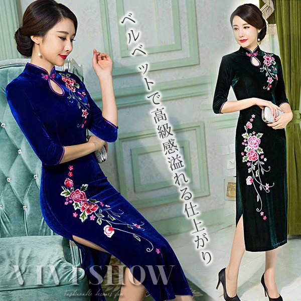 チャイナドレス ワンピース レディース 花柄 刺繍 ロング丈 七分袖 ベルベット エレガント 二次会 結婚式 パーティー きれいめ abr vivishow
