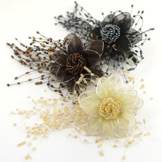 透け感のあるシフォンの花びらに、ビーズ飾り