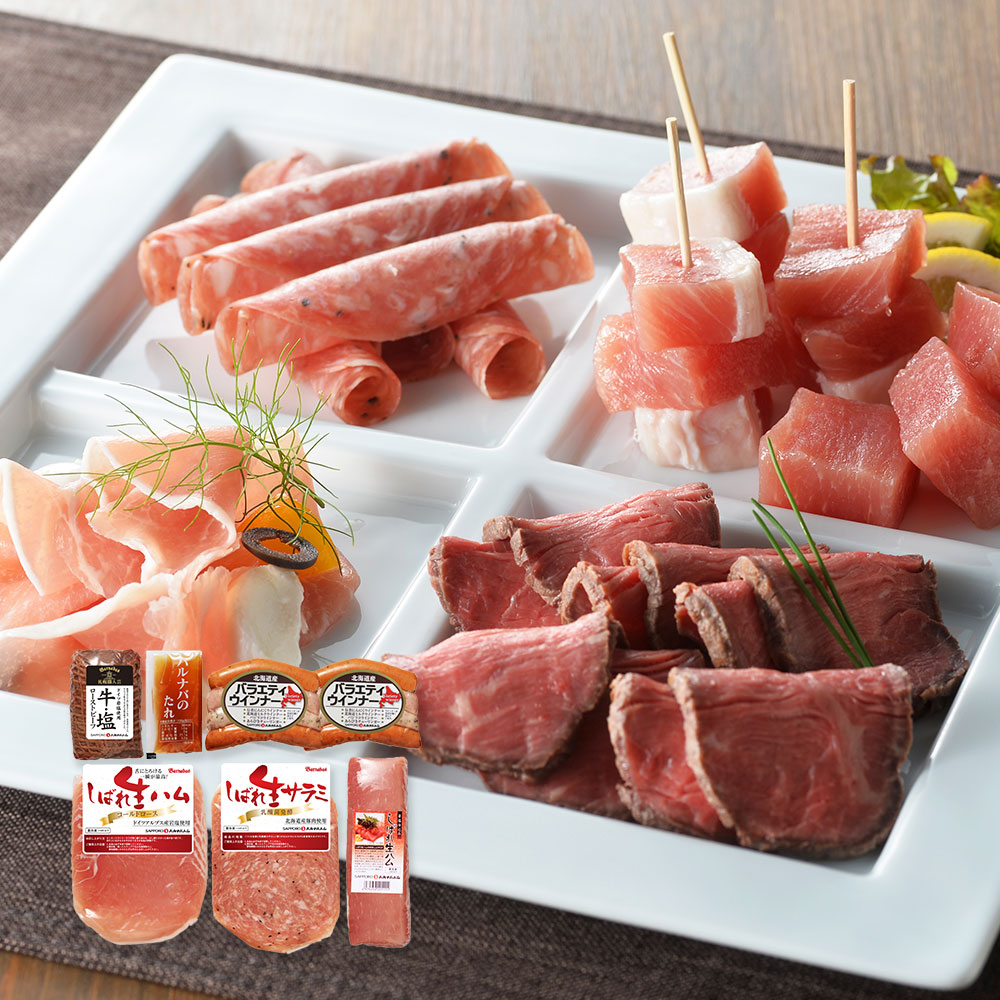 ■規格:ローストビーフ150g、バルナバのたれ20g、しばれ生ハム冊取り200g、バラエティウインナー4種100gx2、しばれ生ハムスライス80g、しばれ生サラミ80g