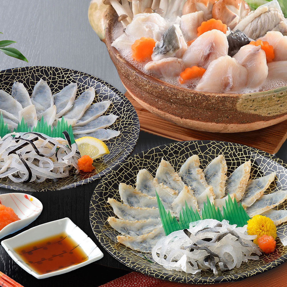 本場・下関の職人が、1枚1枚丹念に盛り付けた、身が固くしまり、歯ごたえが堪らない真ふくたたき刺身と真ふく霜降り刺身、淡白な中にも奥深い味が美味なふくちりをセットにしています。