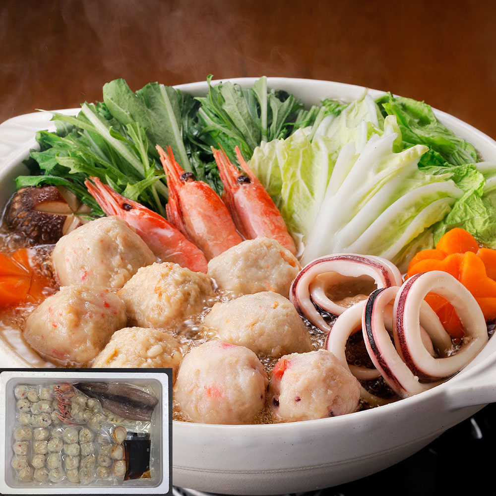 かに入つみれ ・ えび入つみれ ・ とりごぼうつみれ ・ たこ入つみれ など、ボリュームいっぱいのつみれを主役に えび や いか 等の魚介を詰め合わせました。