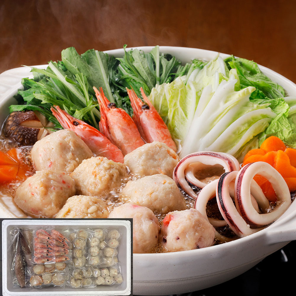 かに入つみれ ・ えび入つみれ ・ とりごぼうつみれ ・ たこ入つみれ など、ボリュームいっぱいのつみれを主役に えび や いか 等の魚介を詰め合わせました。