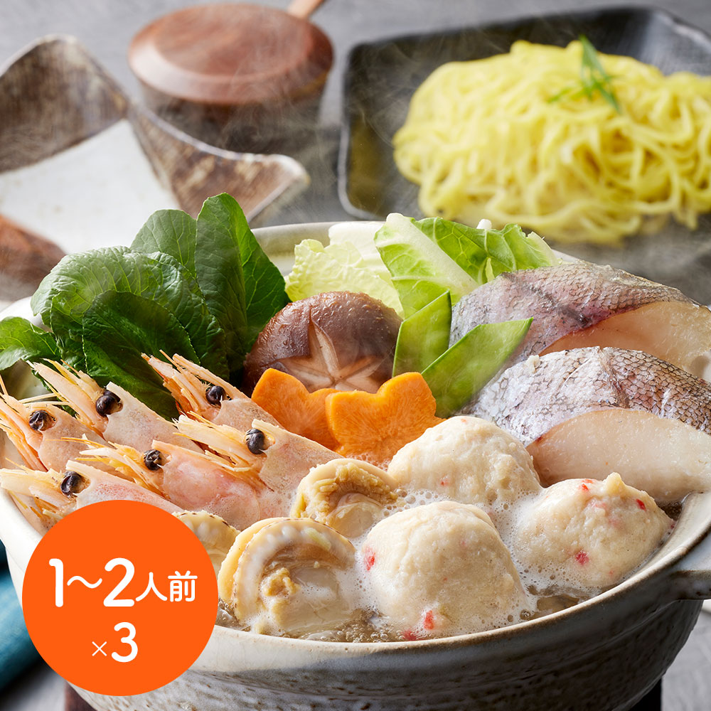 ■規格:個食用 海鮮ちゃんこ鍋セット(助宗鱈切身40gx2切、ボイル海老6gx6尾、ボイル帆立20gx3個、かに入つみれ20gx3個、冷凍生ラーメン80gx1玉、たれ(濃縮:塩)50mlx2袋 ※1~2人前) x3