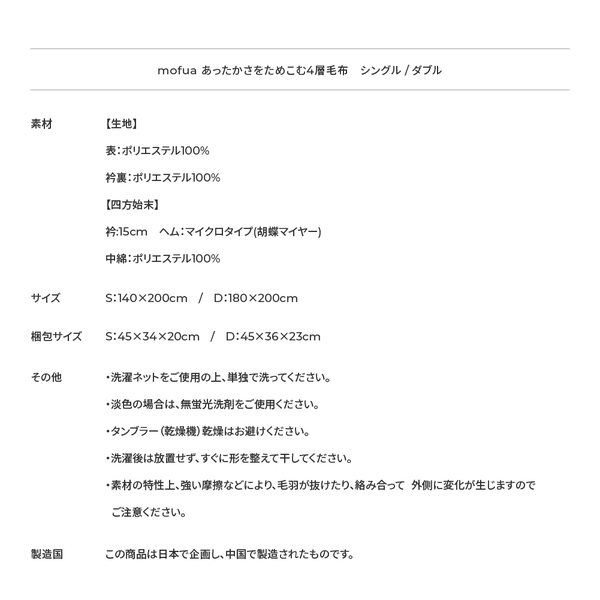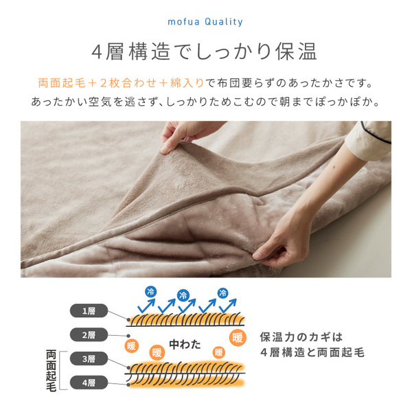 こちらは「mofua あったかさをためこむ4層毛布 シングル ブラウン」の商品ページです。商品画像や商品情報には、色違いやサイズ違いの商品が載っている場合がございます。ご注文前に色・サイズ・セット内容のご確認をお願いいたします。
