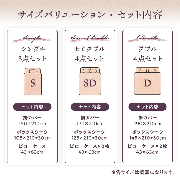 <掛カバー>(約)190×210cm、<ボックスシーツ>(約)145×210+30cm、<ピローケース>(約)43×63cm(2枚)
