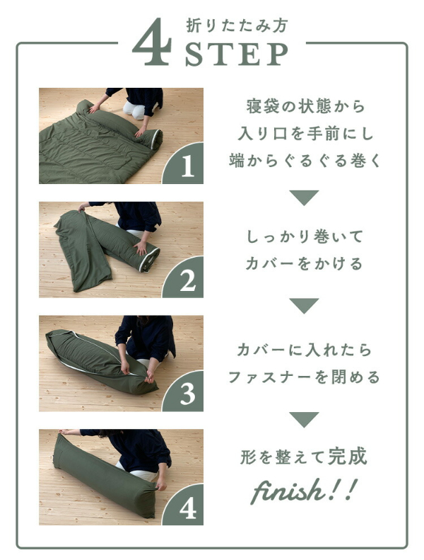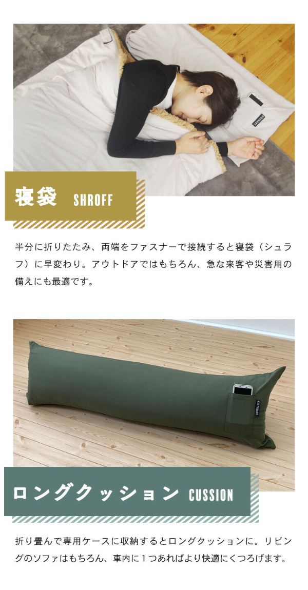 半分に折りたたみ、両端をファスナーで接続すると寝袋(シュラフ)に早変わり。アウトドアではもちろん、急な来客や災害用の備えにも最適です。