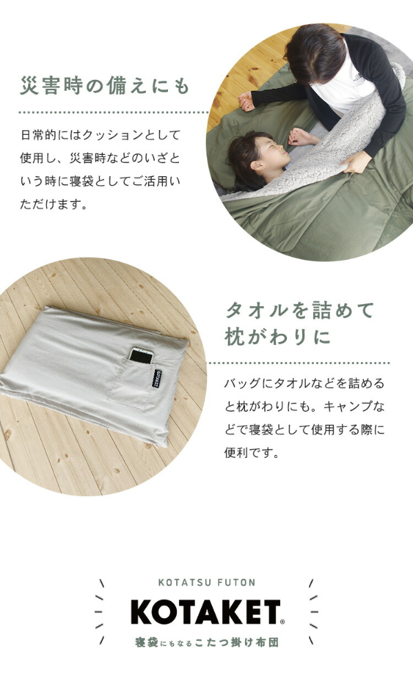 こたつ布団、寝袋、クッションとして、3つの形に変化して大活躍。家の中でもキャンプでも、そして、防災対策にも。いろんなかたちで暖かい1枚です。