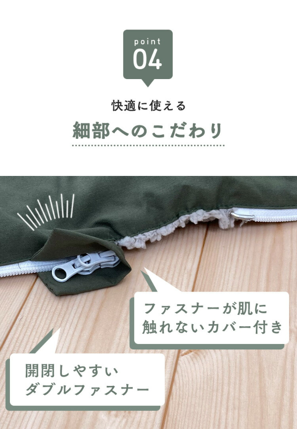 ファスナーをすべて開けば一枚の大きなこたつ掛け布団に。ボア生地とふんわりの中わたで、こたつをより暖かくしてくれます。