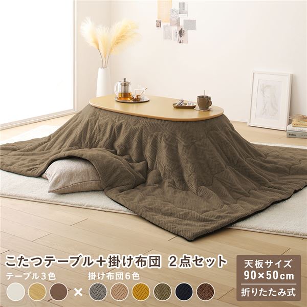 こたつ 2点セット 約幅90cm ナチュラル×カーキ 楕円形 折りたたみ こたつテーブル こたつ掛け布団 完成品 業務用 まとめ買い