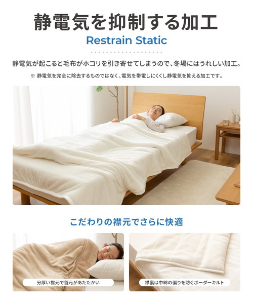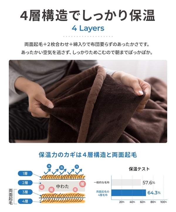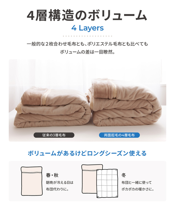 2枚合わせ毛布に中綿を加え、裏面も起毛させる事で暖かい空気をたっぷり含んで保温力を逃がさない!あったかさ抜群のボリューム4層毛布に新色登場!