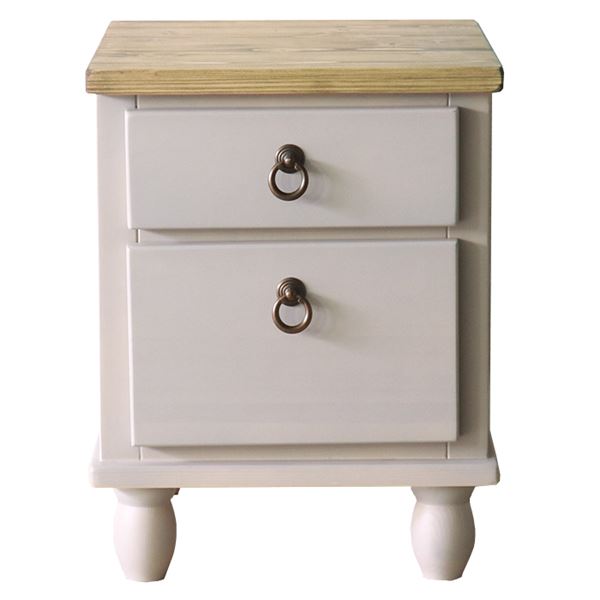 取っ手がかわいい、2杯引き出し付きのナイトテーブル。ベッドと組み合わせるとさらに使いやすいアイテム。