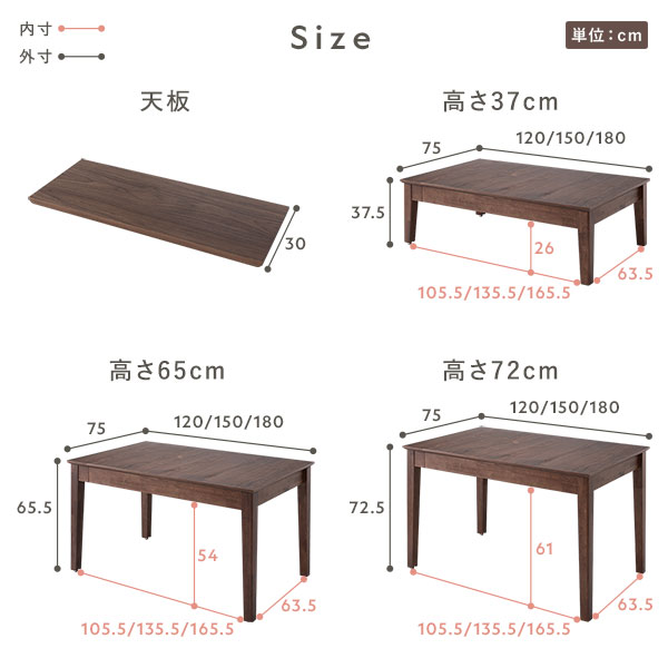 高さ72cm:幅120/150/180×奥行75×高さ72.5cm