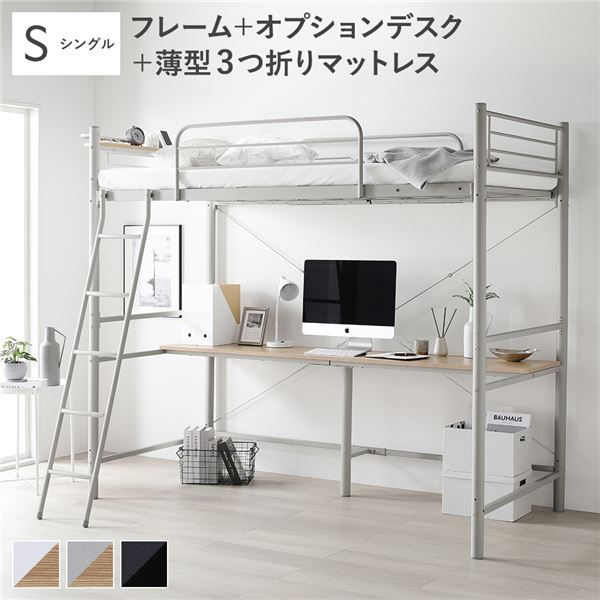 ロフトベッド シングル 〔ベッドフレーム ライトグレー + オプションデスク ライトグレー×ナチュラル + 薄型3つ折りポケットコイルマットレス〕 宮付...爆買