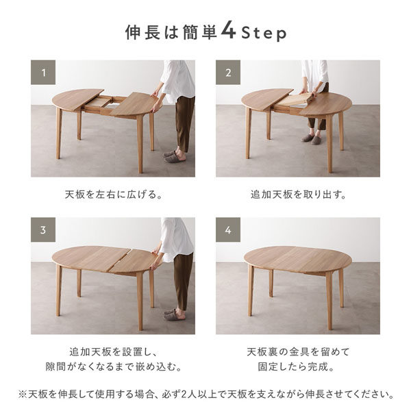 ・オーバルエクステンションテーブルは、天板に収納されている追加天板を使用することで天板を伸長することが可能です。