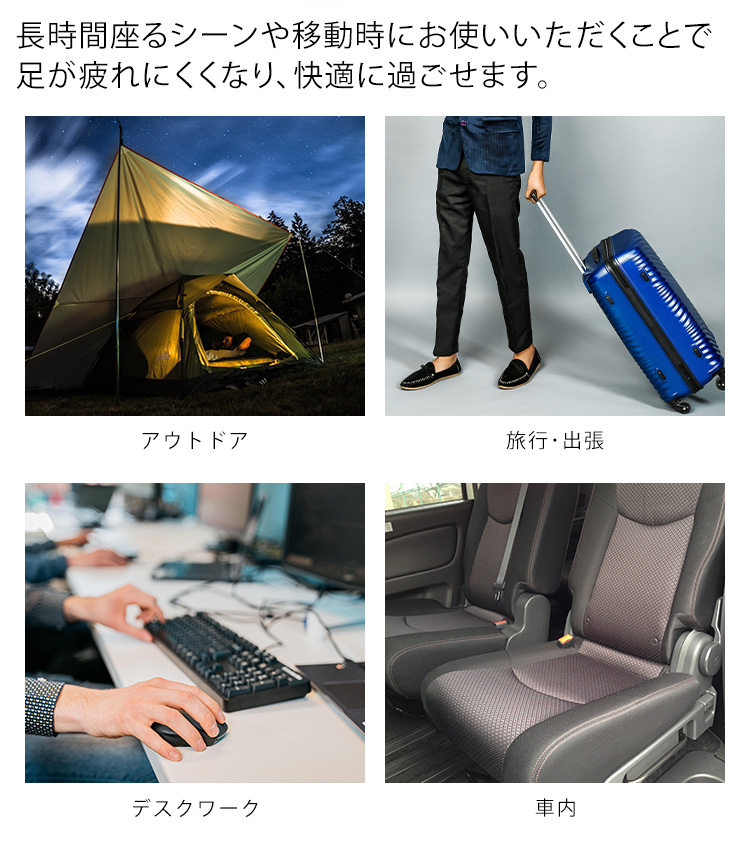 長時間座るシーンや移動時にお使いいただくことで足が疲れにくくなり、