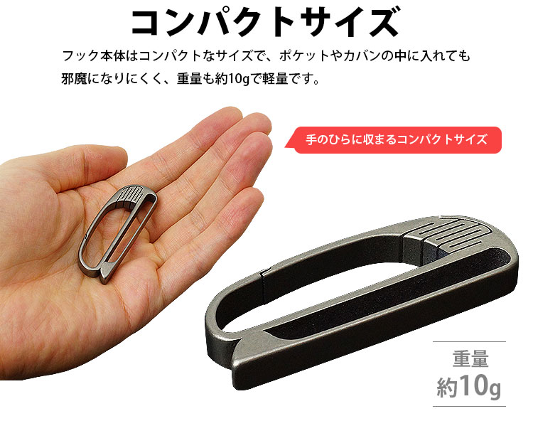 フック本体はコンパクトなサイズで、ポケットやカバンの中に入れても邪魔になりにくく、重量も約10gで軽量です。