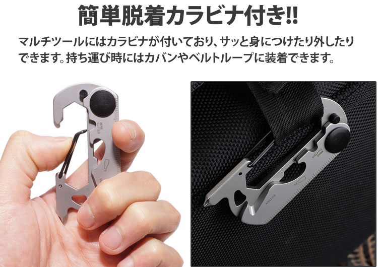 マルチツールにはカラビナが付いており、サッと身につけたり外したりできます。