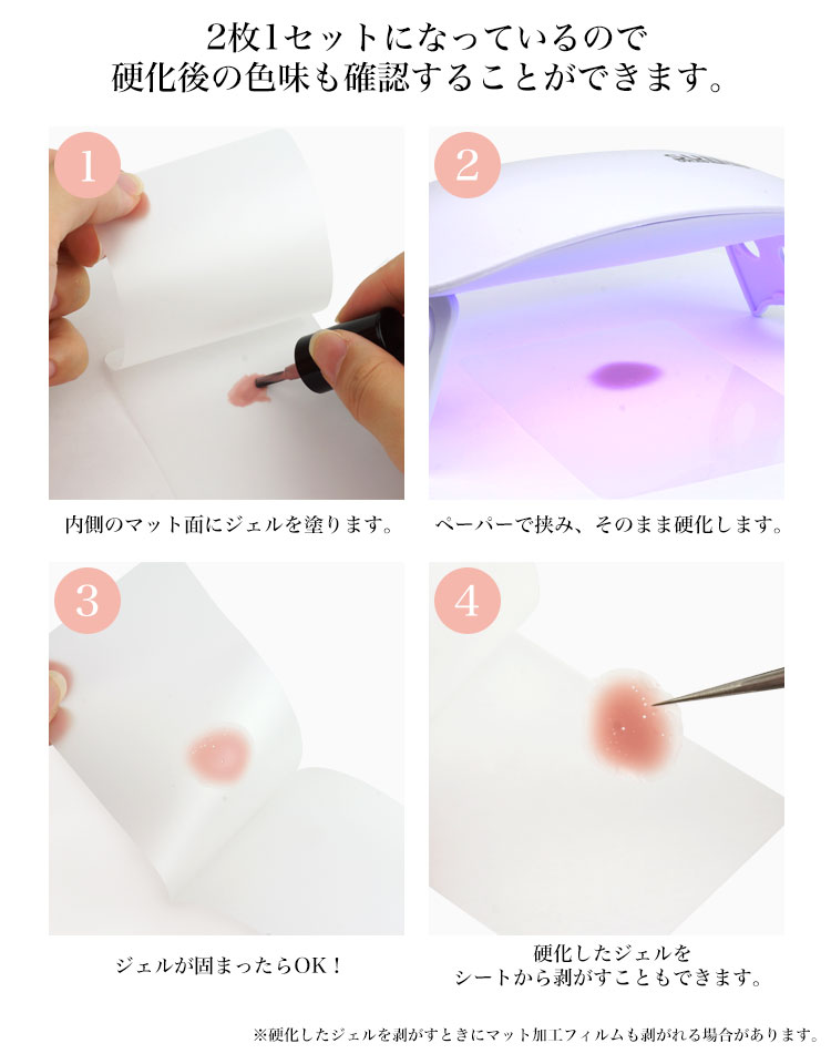 ※マット面で硬化したジェルを剥がすときに、マット加工フィルムが剥がれる場合がございます。