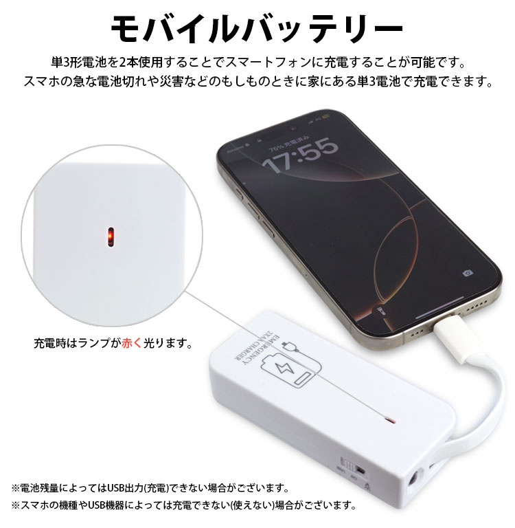 災害の際などもしもの時に家にある単三電池でスマホ等を充電することができます。